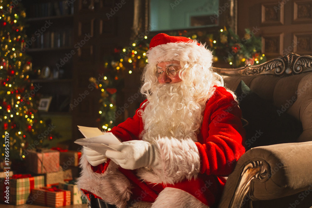 Merry Christmas. Happy Santa Claus reading letters from children in festive Christmas living room. Santa with xmas wish list letter on Christmas eve. Mail of Santa Claus. Winter Holiday Celebrations