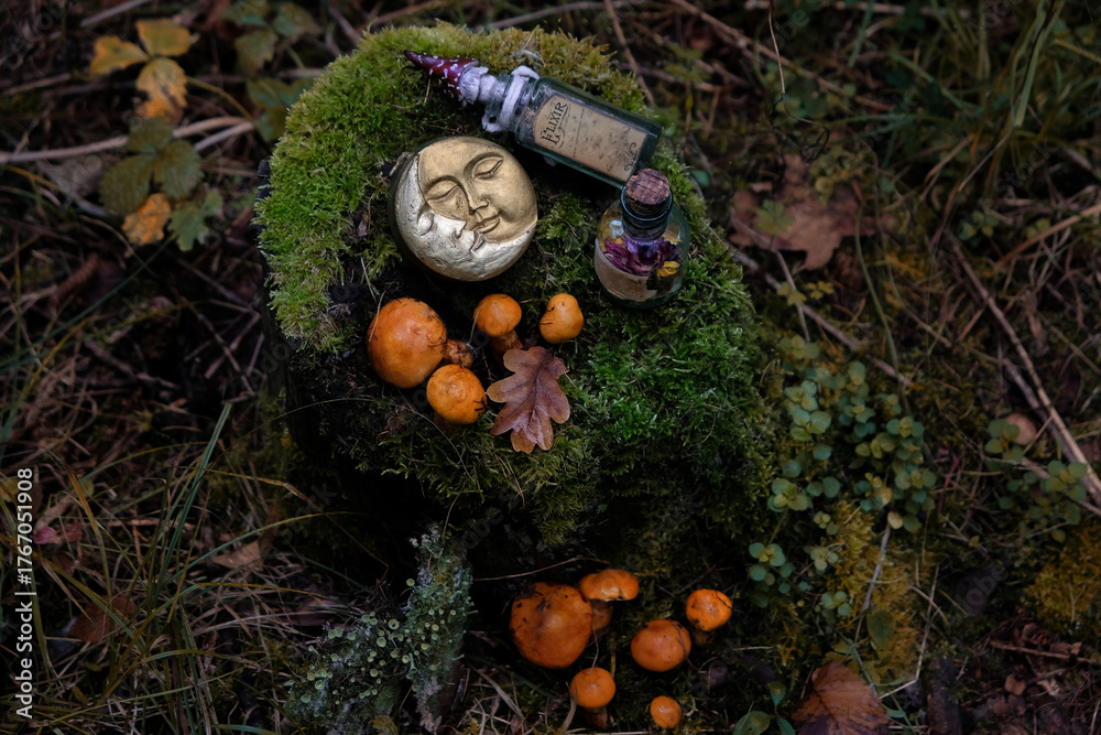 moon amulet, witch bottles, mushrooms on tree stump in forest, natural background. Magic ritual, witchcraft, occult esoteric spiritual practice. autumn season. fairytale, mystery atmosphere. top view