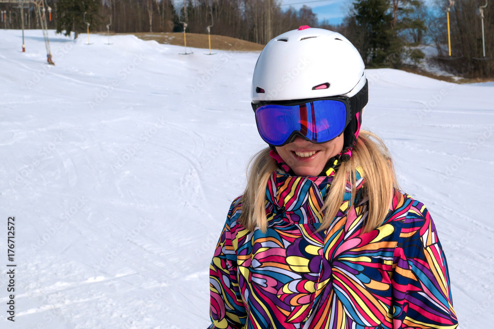Portrait of young woman in helmet ski in winter time winter vacation.