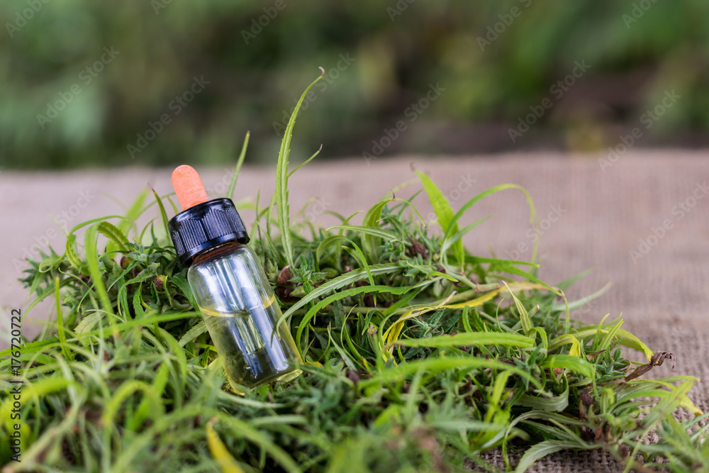 Medicinal cannabis with extract oil in a bottle