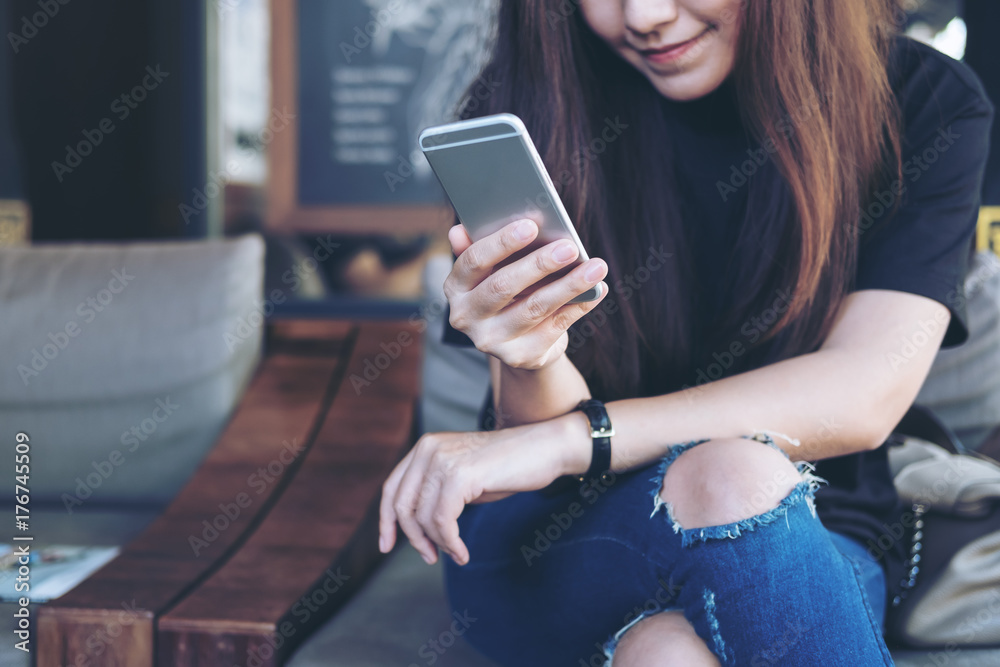 Closeup image of a beautiful Asian woman holding and using at smart phone sitting cross leg in modern cafe