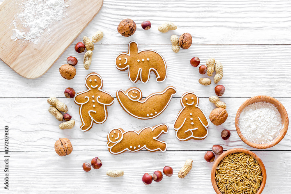 Healthy food for sportsman. Cookies in shape of yoga asanas near nuts on white wooden background top view copyspace