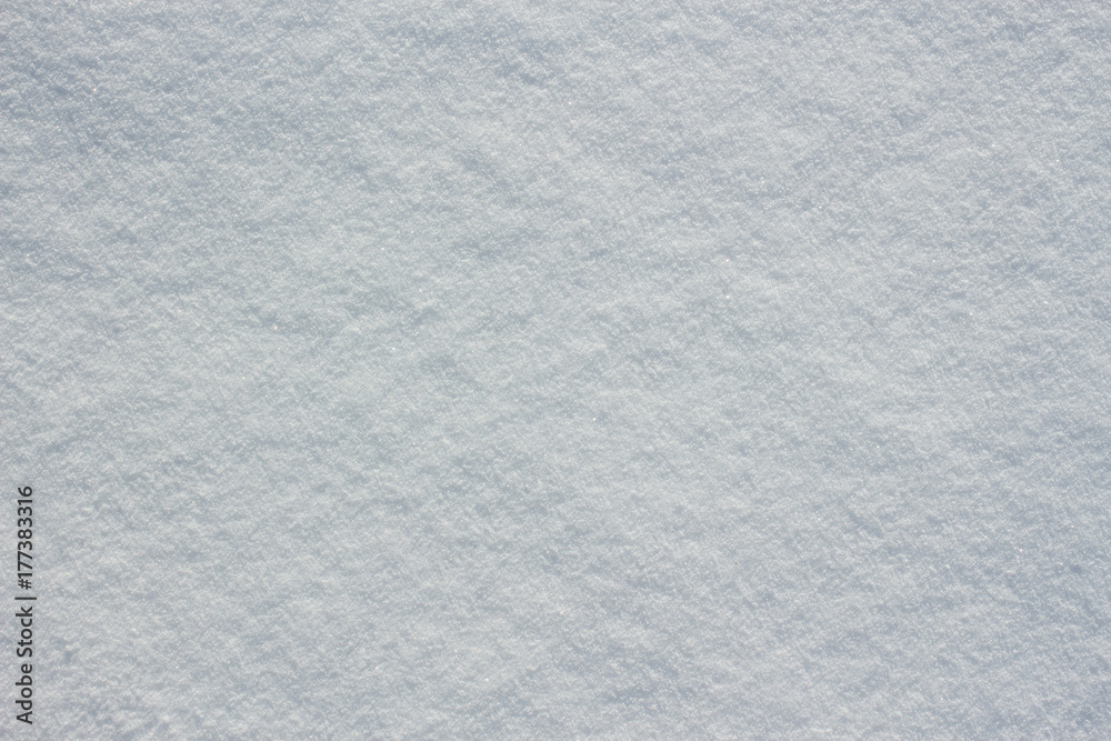 Texture of fresh snow covering ground thickly on frosty winter morning outside. View from above. Horizontal color photography.