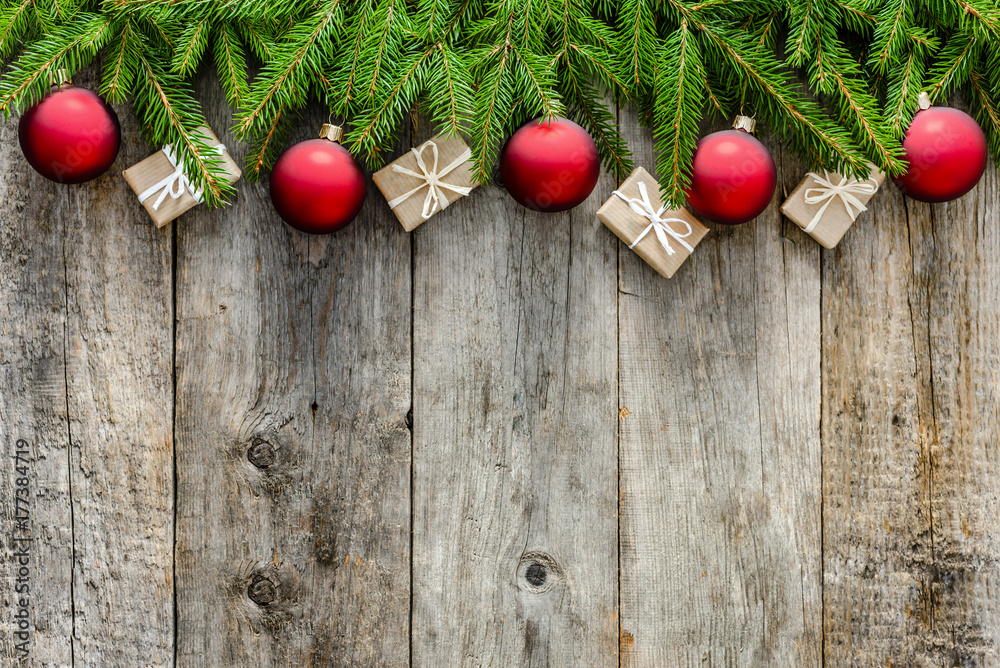 Wooden background with christmas decorations, red ornaments and christmas gift boxes, festive frame with copy space