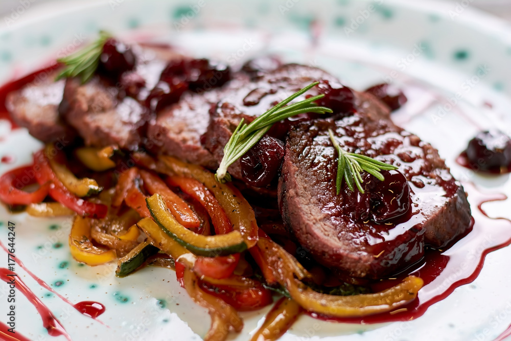 Appetizing beef in sweet sauce close up. Chopped beef meat in cherry sauce with vegetables on plate. Delicious european cuisine.