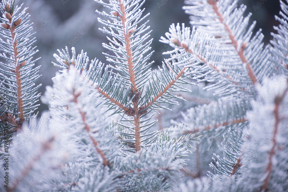 Winter and Christmas Background. Close-up Photo of Fir-tree Branch Covered with Frost.