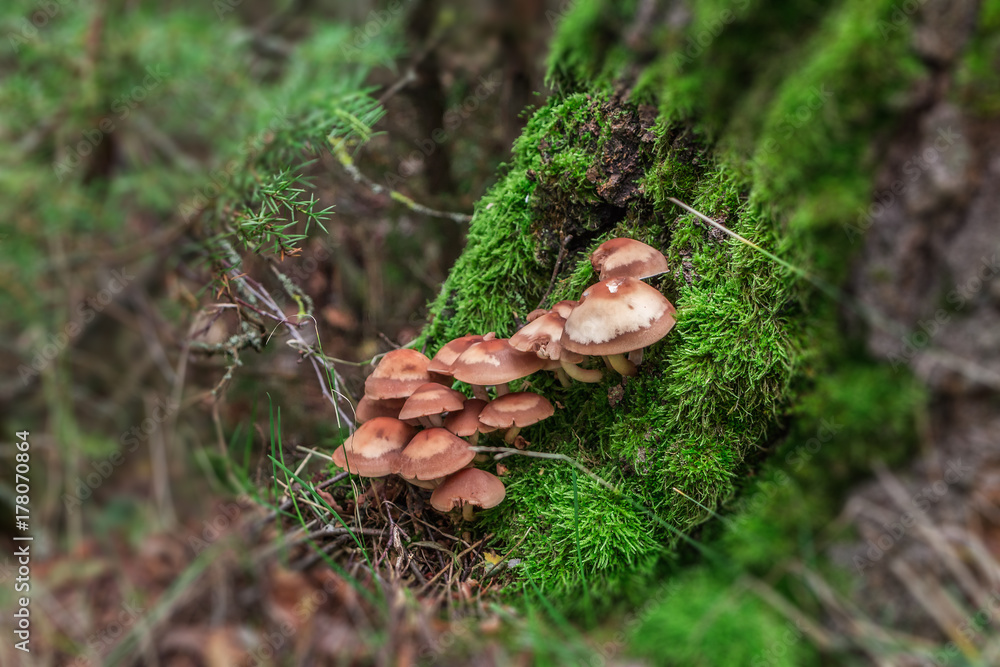 Family of brown mushrooms on a tree trunk in an autumn forest.