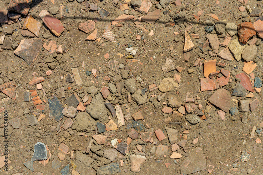 Industrial composition of tracked mini excavator undercarriage and dozer blade showing traction patterns, hydraulic structure, and compact construction machinery design