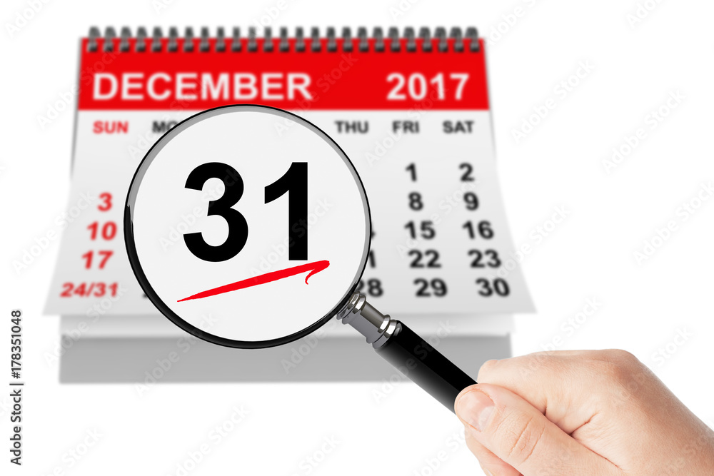 New Year Eve Concept. 31 December 2017 calendar with magnifier
