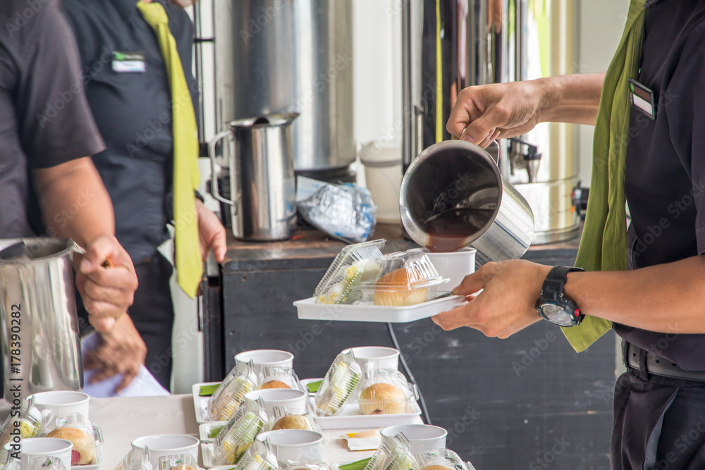 employees are served coffee break between meeting and snack on dish with colorful bokeh background,concept.