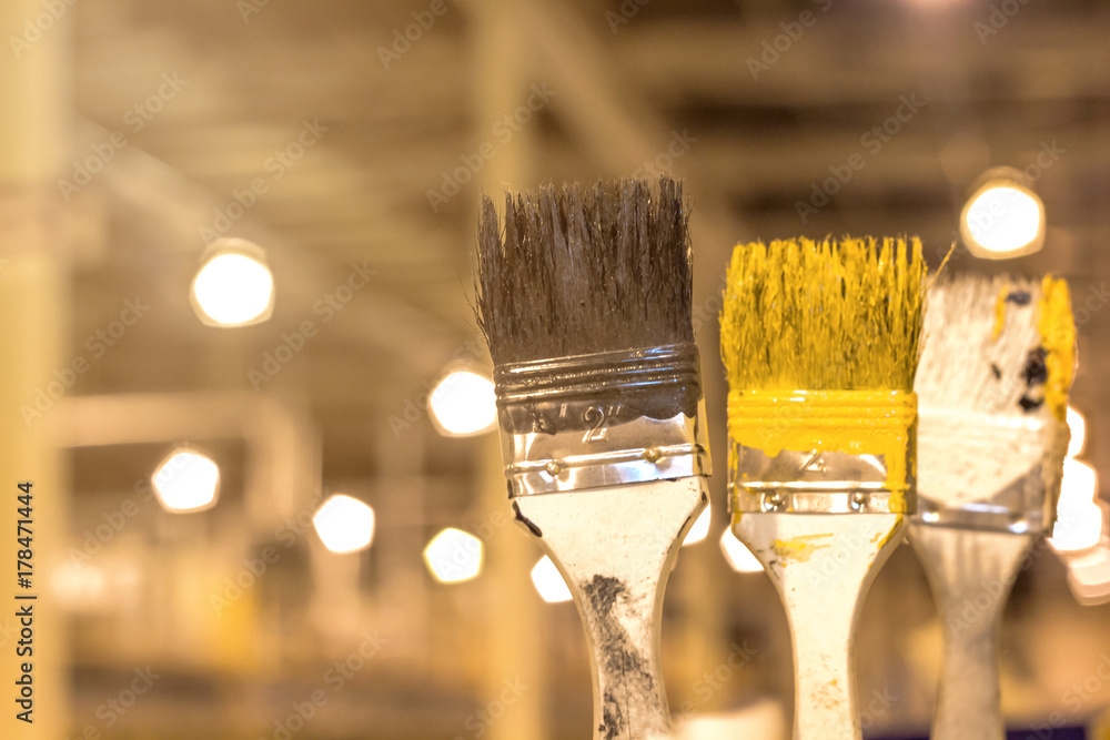 Old Paint brush used resting on paint background for design,selective focus under yellow light