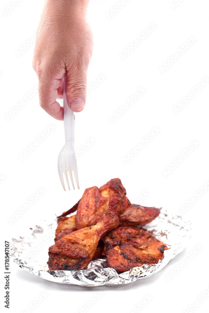 Hand holding serving roasted chicken in aluminum foil with plastic fork. Food and appetizer concept. Kitchen and cooking theme. Delicious grilled leg and wing on isolated white background