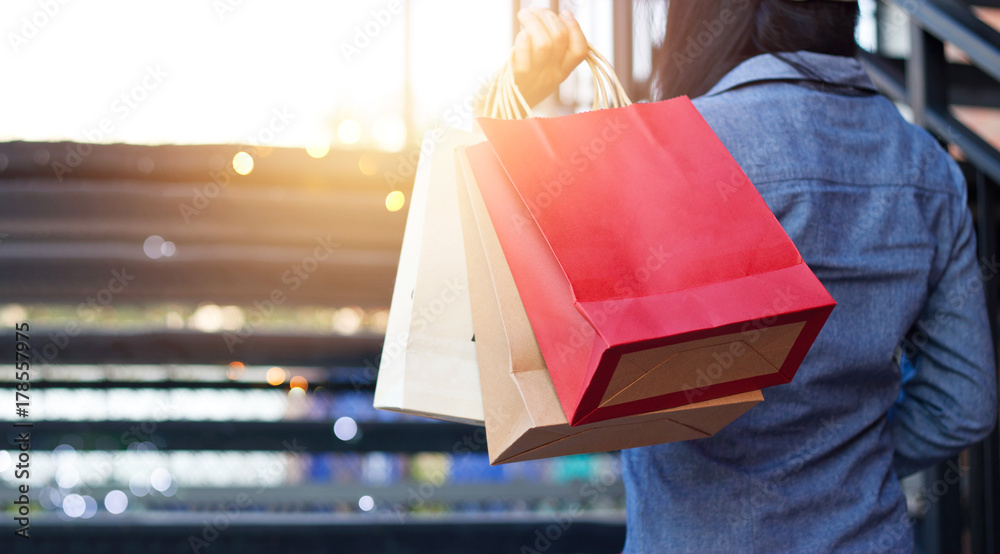 Rear view of woman holding shopping bag while up stairs outdoors on the mall background