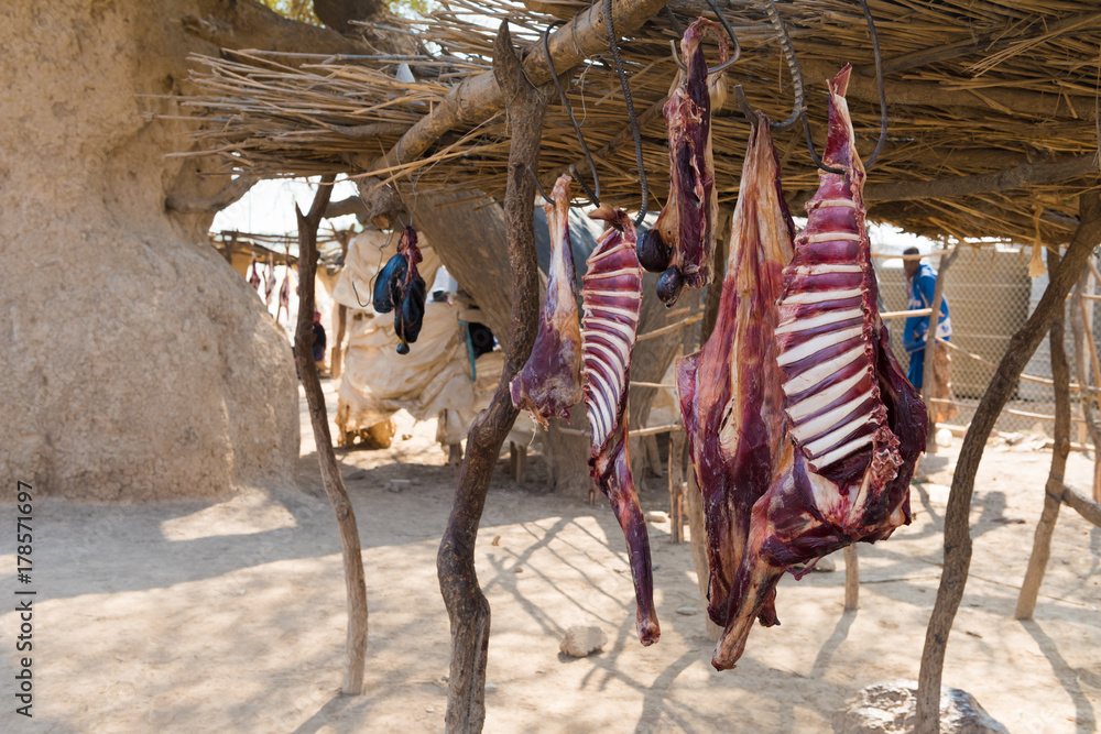 Fleischstücke, Springbock, hängen an einem afrikanischen Marktstand zum Verkauf