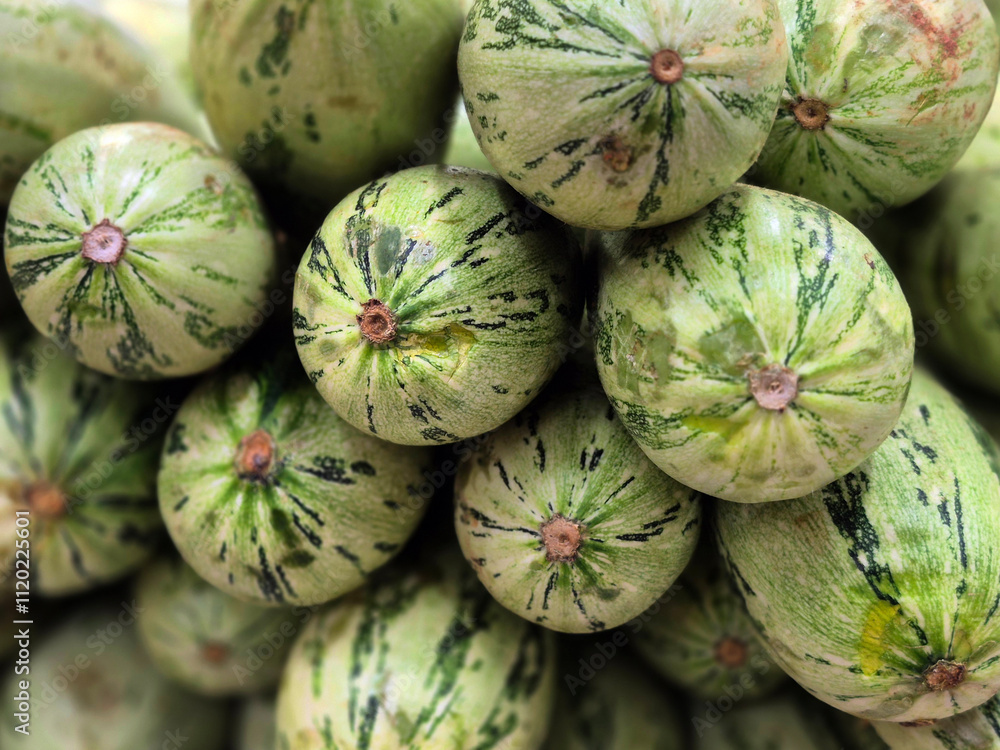 A bunch of wild mini apples on a branch surrounded by green leaves. The mini apples are pear-shaped.