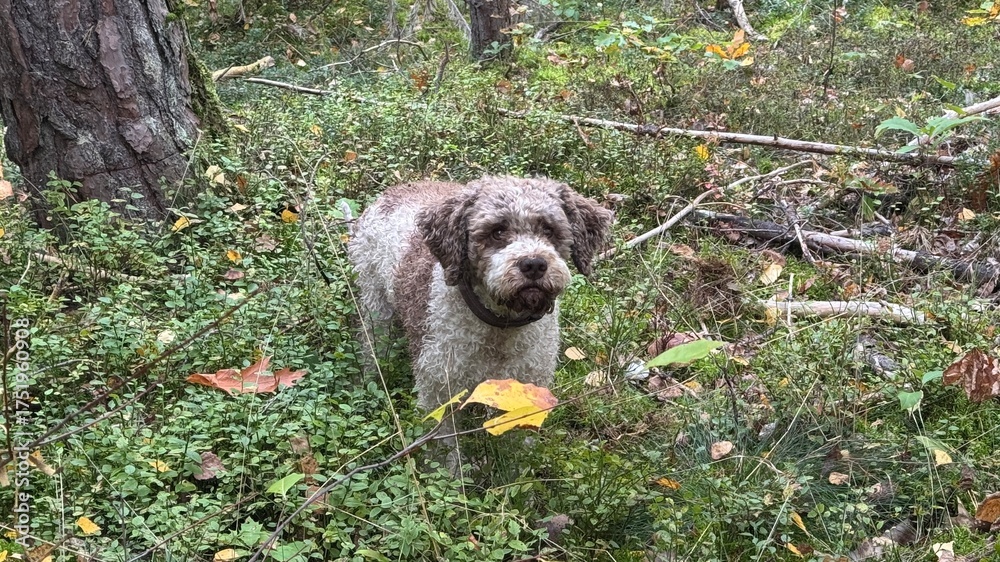 Christmas symbols - stocking, candles, fir-tree, tangerines, candy cane, cinnamon, filbert on a dark wooden background