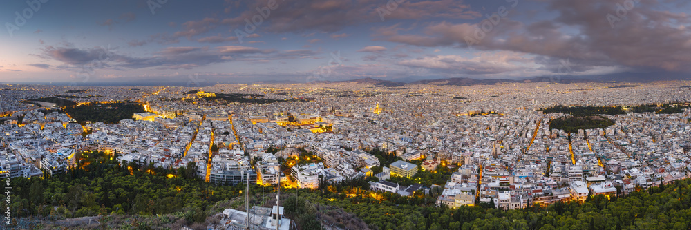View of Acropolis and city of Athens from Lycabettus hill at sunrise, Greece.