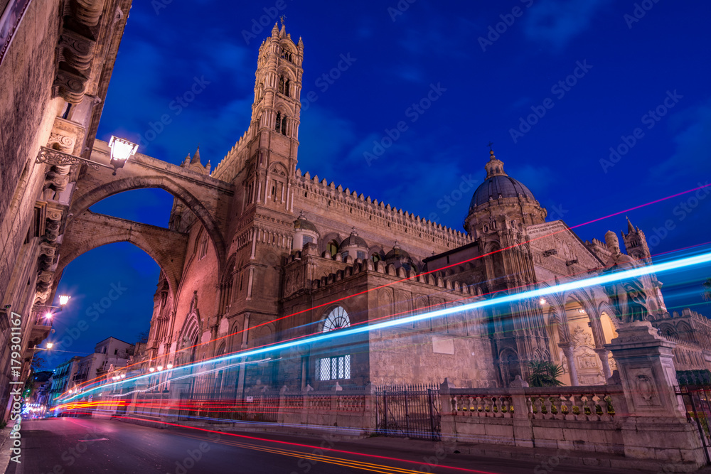 Vista notturna della Cattedrale di Palermo, Italia