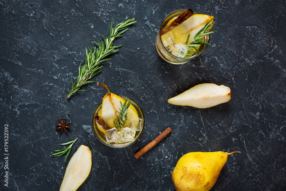 Pear cocktail with rum, liquor, pear slices and rosemary on an black stone table, selective focus.