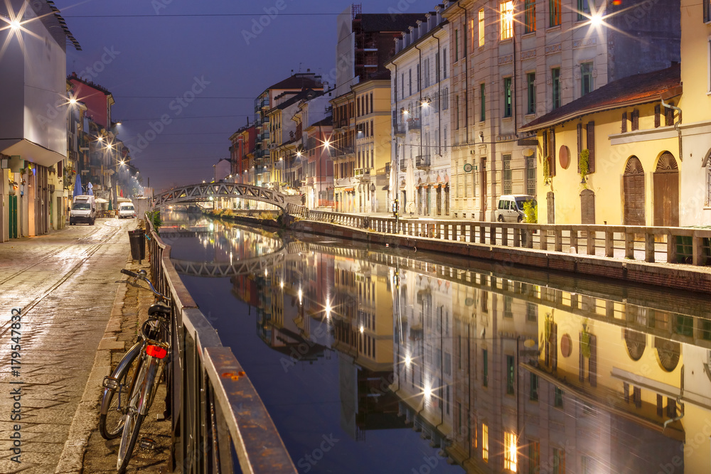 Bridge across the Naviglio Grande canal at night, Milan, Lombardia, Italy