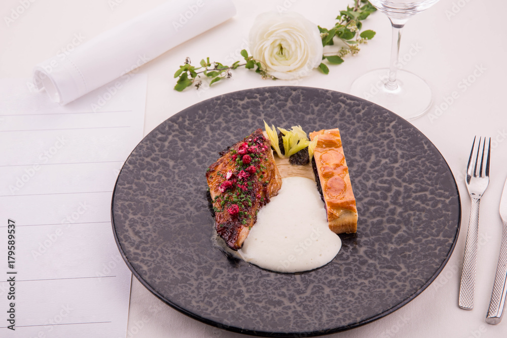 The breast of a guinea fowl with the glazed cranberry, is served with pie from bilberry and blackcurrant with the girasol and morels fried on melted butter with onions