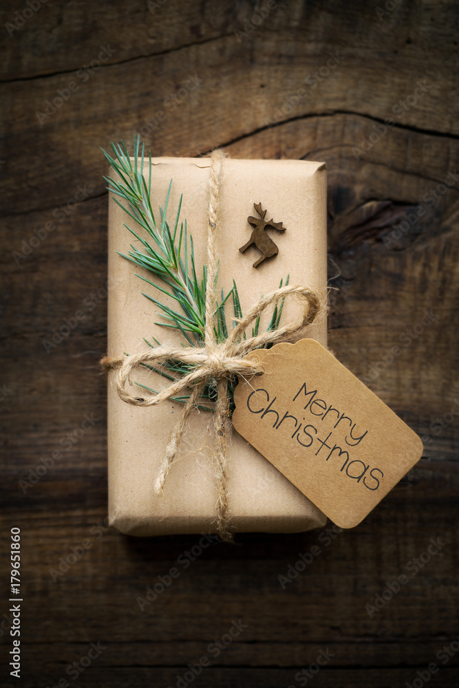 Kraft paper wrapped Christmas gift with a tag tied with rustic jute twine and decorated with green fir branch and wooden reindeer
