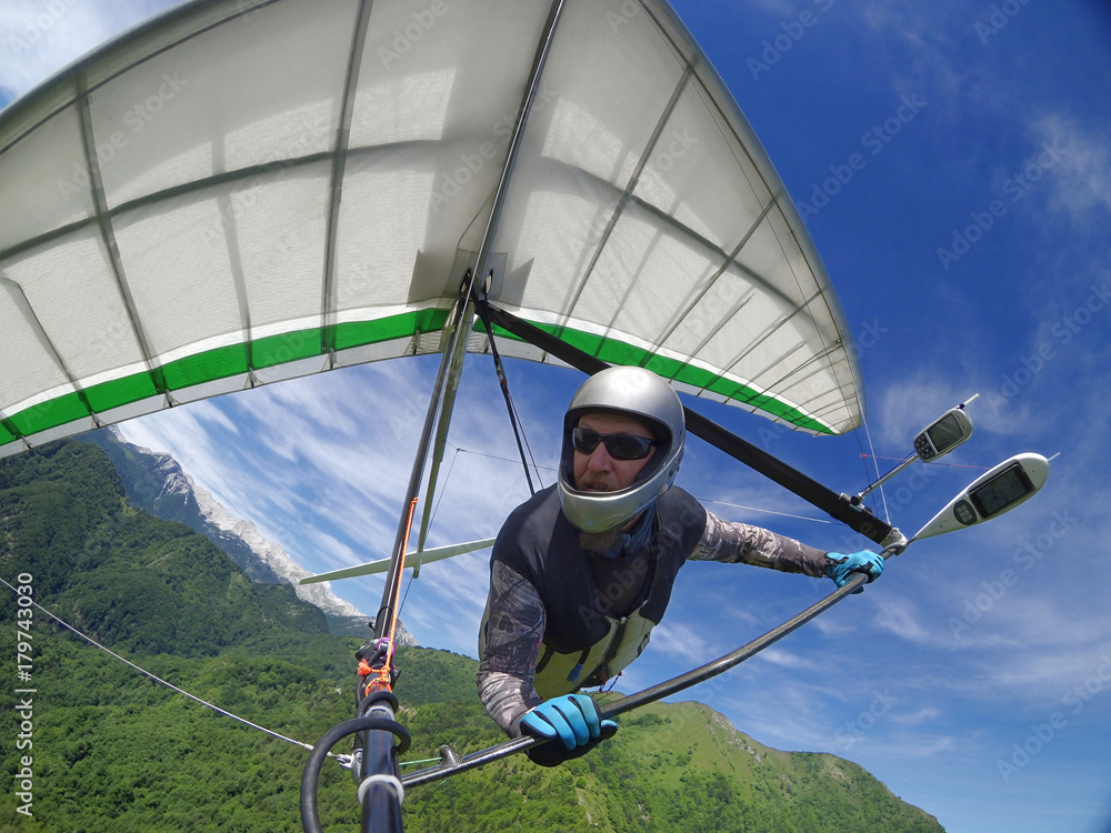 Hang glider pilot soaring the thermal updrafts above green mountain hills