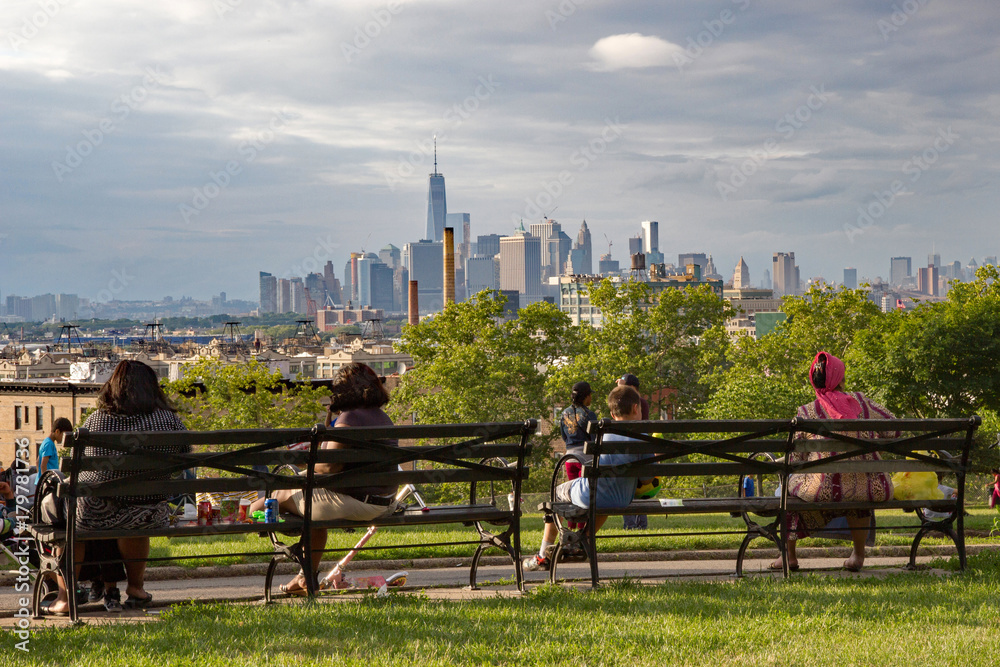 New York's diversity represented by people sat on a bench in Sunset Park, Brooklyn, admiring the view of Lower Manhattan on a sunny summer's day
