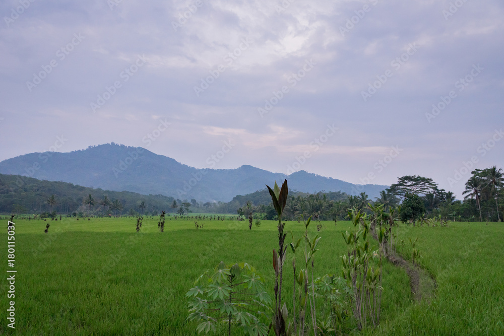 rice produce grain in the rural rice paddy fields in Indonesia, South East Asia