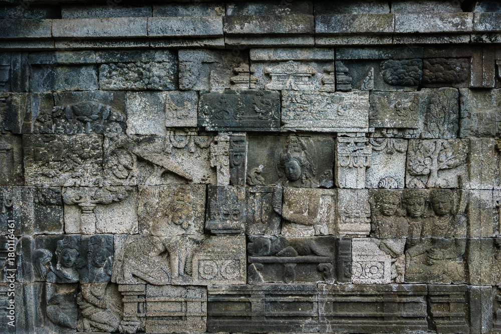Carved relief at Borobudur on Java Indonesia. Borobudur is a Buddhist stupa and temple complex in Central Java and a UNESCO World Heritage Site.