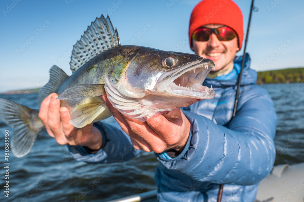 Happy angler holds fish Zander (Sander lucioperca) sitting in a boat with river on the background