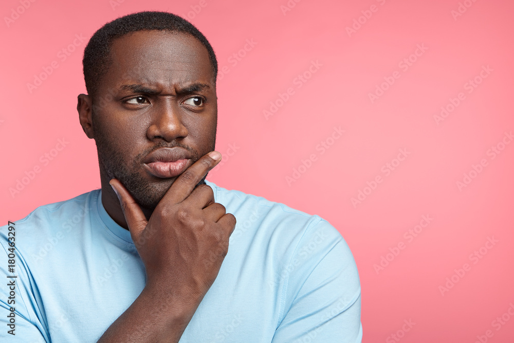 Serious dark skinned male enterpreneur dressed casually, looks thoughtfully aside, tries to create new strategy in his business, thinks how to do it better, being deep in thoughts, poses on pink wall