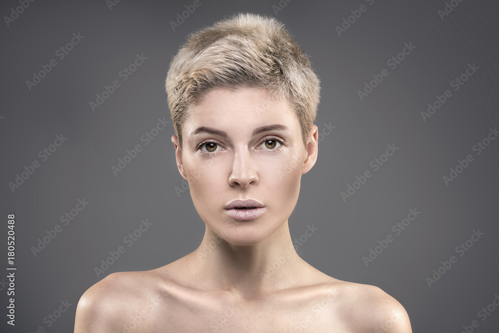 Portrait of blonde short hair girl in studio.