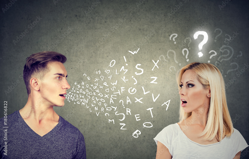 Language barrier concept. Handsome man talking to an attractive young woman with question mark
