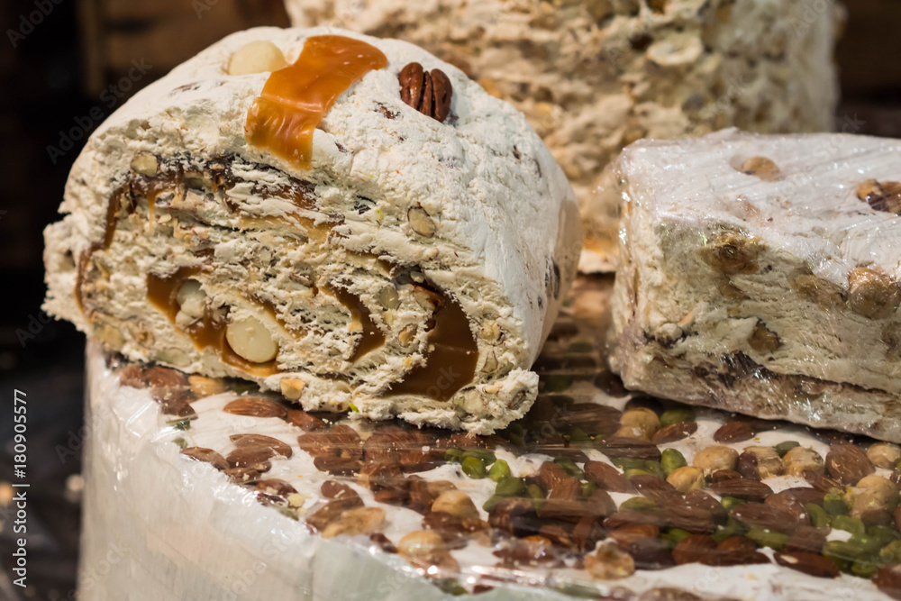 Nougat with raisins, almonds and pistachio at Chocolate Exhibition, "Salon du Chocolat", Bruxelles, Belgium