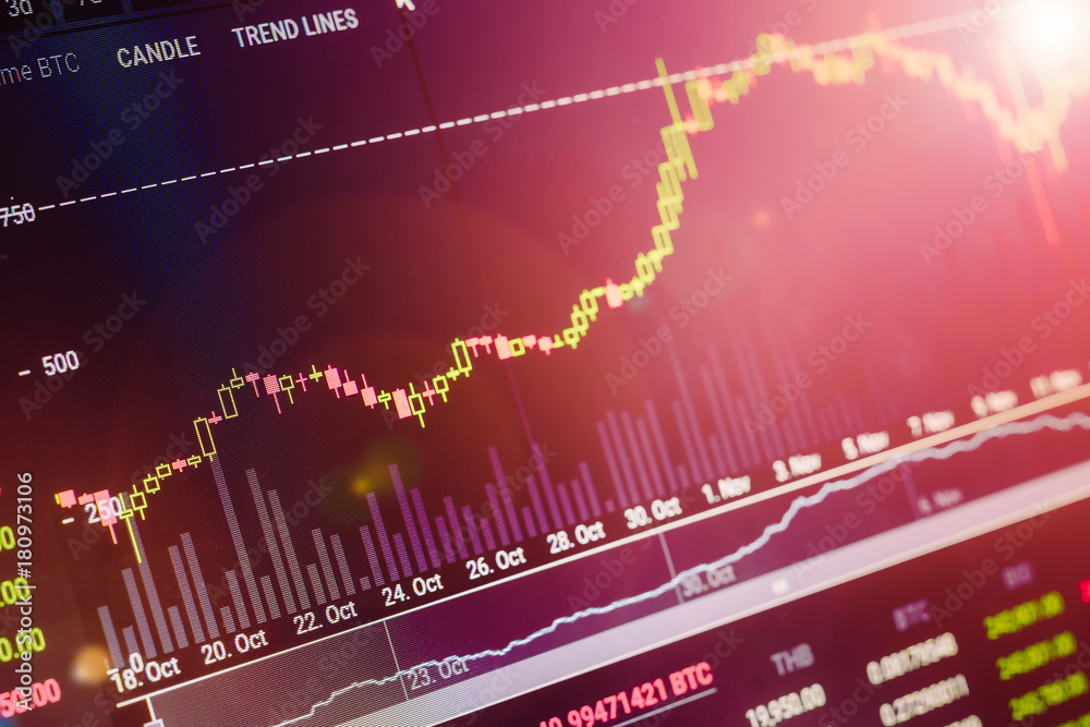 Data analyzing in exchange stock market: the candle chars on display. Analytics price change cryptocurrency BTC.