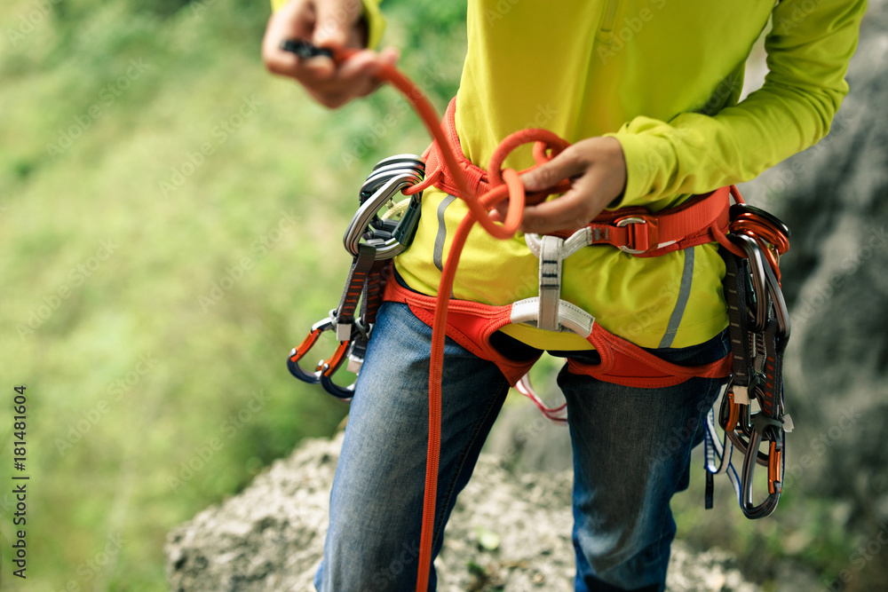 Сlimber wearing safety harness making a eight rope knot