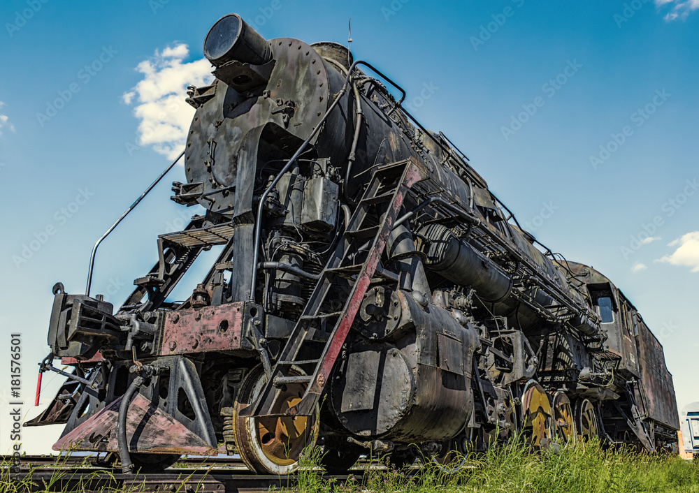 The old black locomotive stands on the iron tracks outside the city.