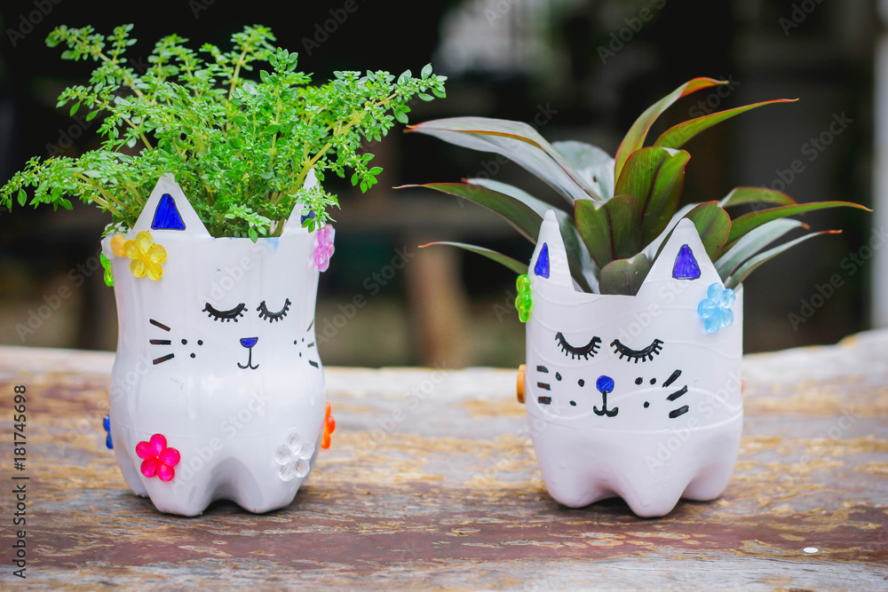 Cute little girl with D.I.Y water bottles, D.I.Y Plastic Bottle Craft for kids,Crafts with kids , Reuse a water bottle , selective focus , Thailand.