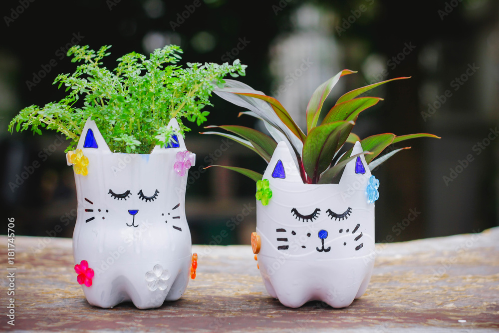 Cute little girl with D.I.Y water bottles, D.I.Y Plastic Bottle Craft for kids,Crafts with kids , Reuse a water bottle , selective focus , Thailand.