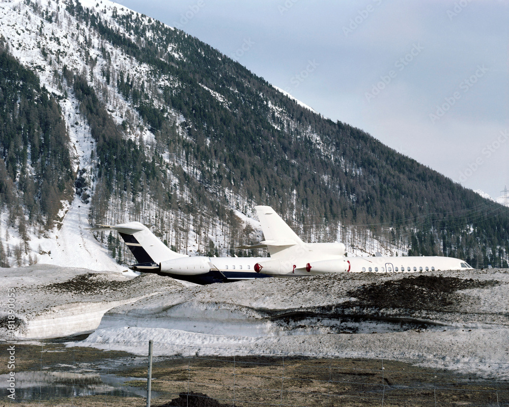 Private jets in the snow covered landscape and mountains in St Moritz Switzerland