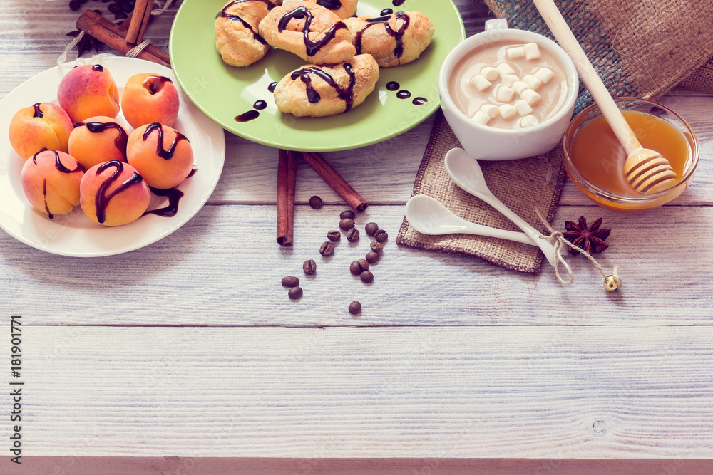 Breakfast of coffee, croissants, apricots, honey, cinnamon and anise