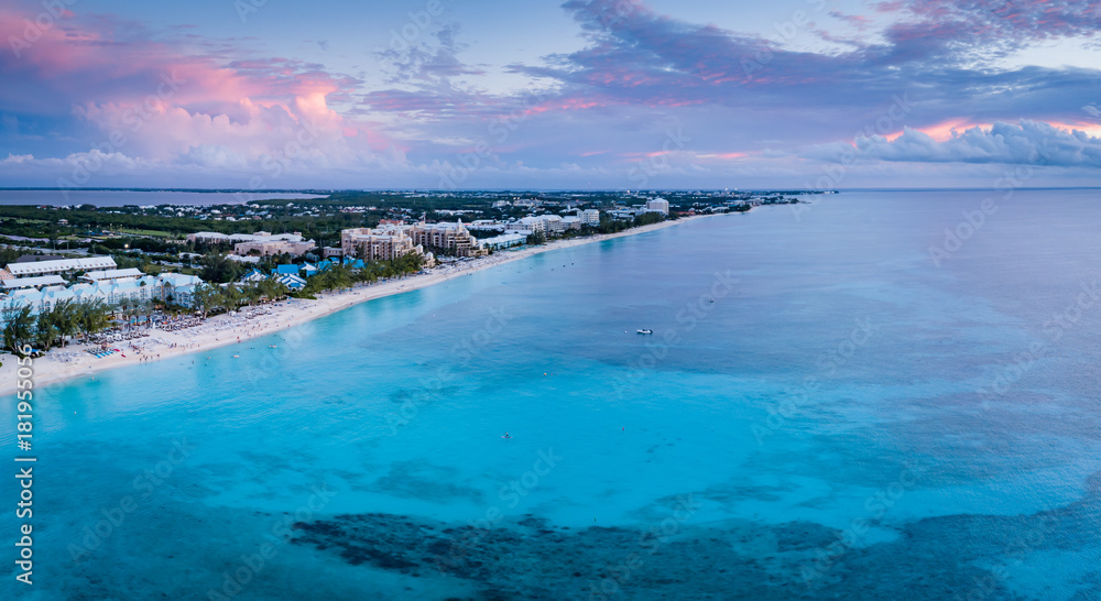 aerial panoramic view of seven mile beach in the tropical paradise of the cayman islands in the caribbean sea after sunset