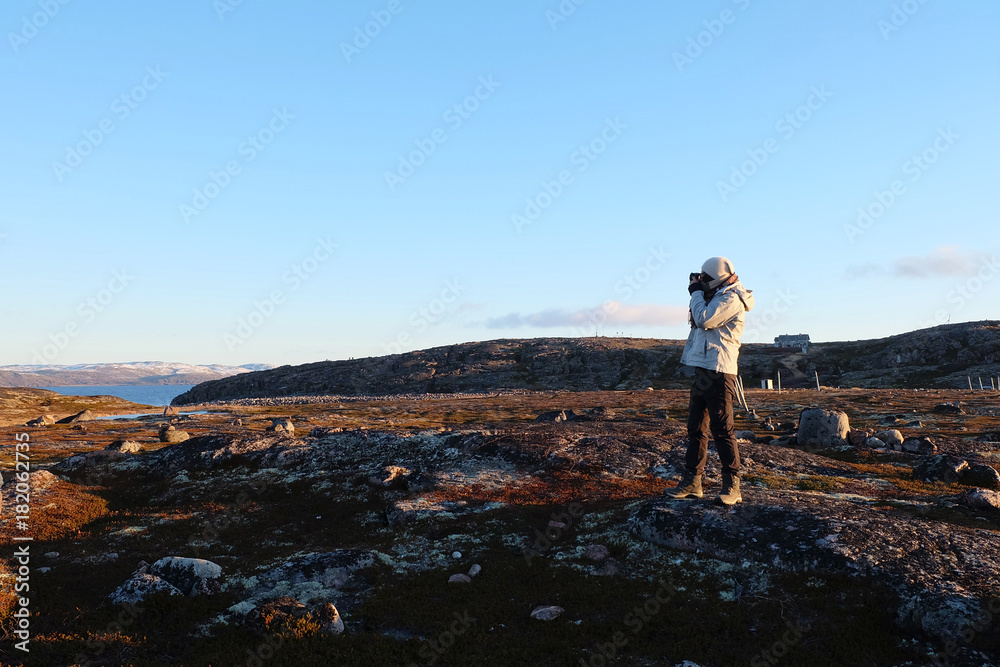 Woman traveler took a photo with beautiful landscape of tundra meadow