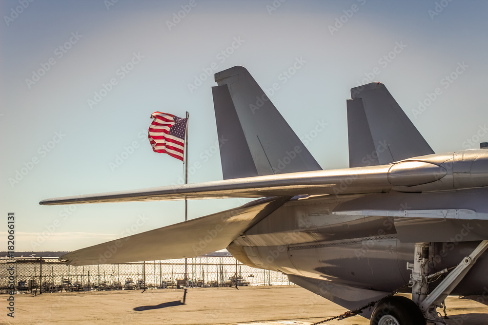 Retired World War II Airplane With American Flag. Historic WW II airplane with American Flag in the background.