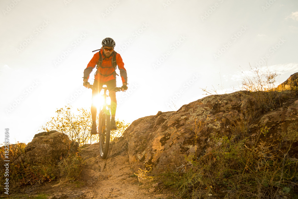 Cyclist in Red Riding the Bike on Autumn Rocky Trail at Sunset. Extreme Sport and Enduro Biking Concept.