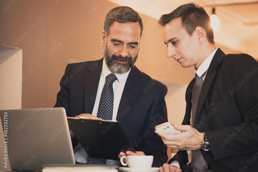 Senior business man, a boss, discussing a project with his junior employee in a coffee shop