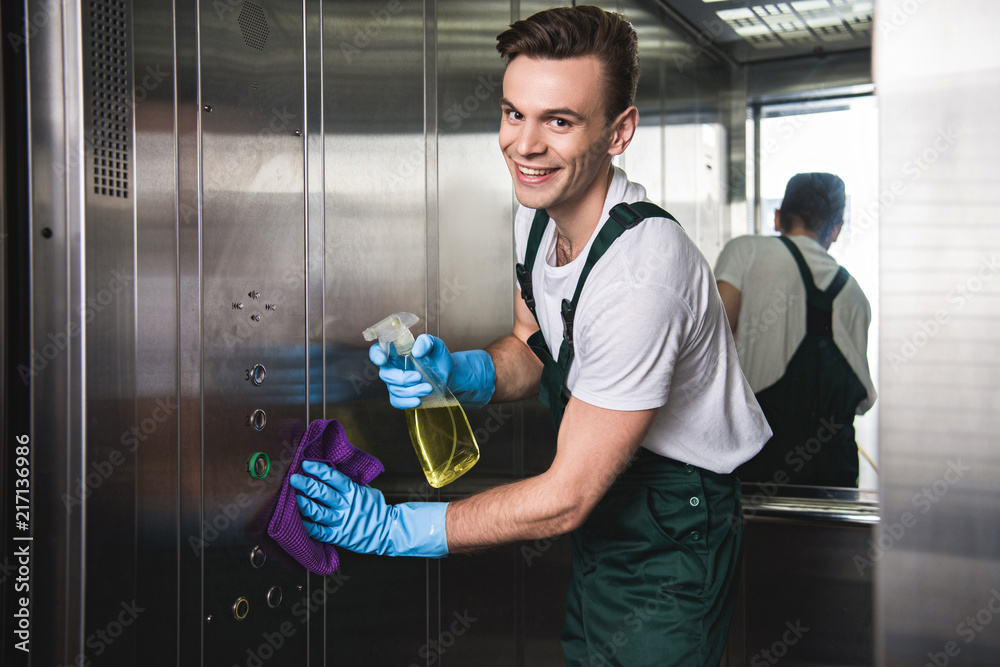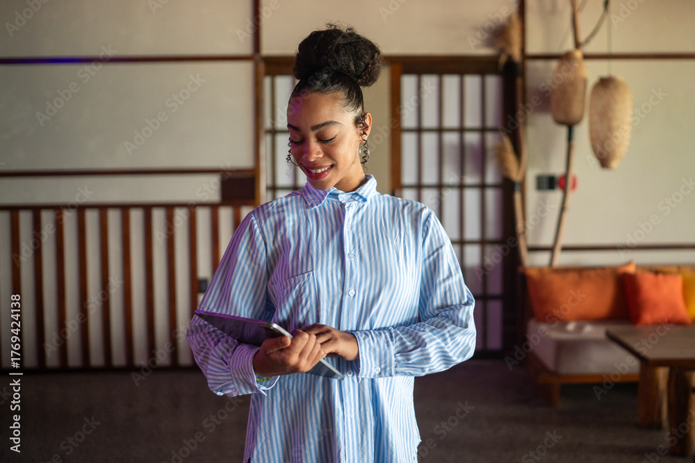 Young woman with natural skin applying foundation with makeup brush while looking into a mirror. Visible foundation streak texture on cheek. Clean beauty routine concept, isolated on white background