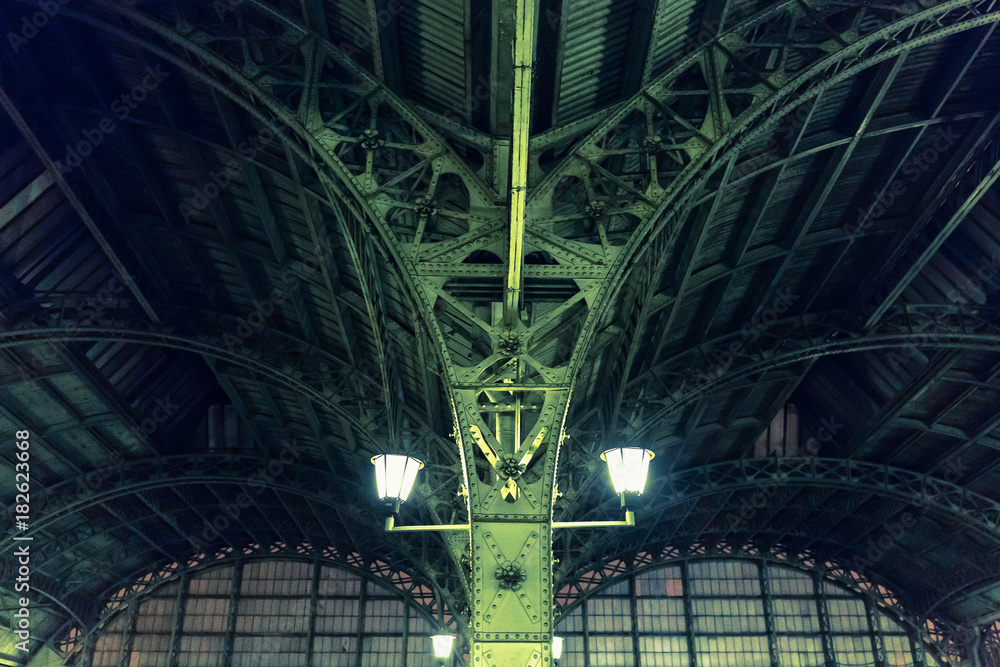 Fragment of roof construction the city railway station Vitebsky. Vaulted structure of steel roof frame truss and windows. Railroad station platform in Saint Petersburg, Russia.