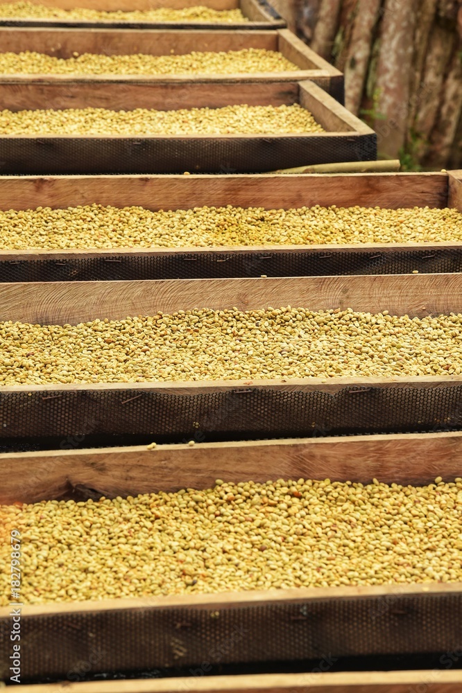 Coffee beans dried in the sun, Coffee beans raked out for drying prior to roasting